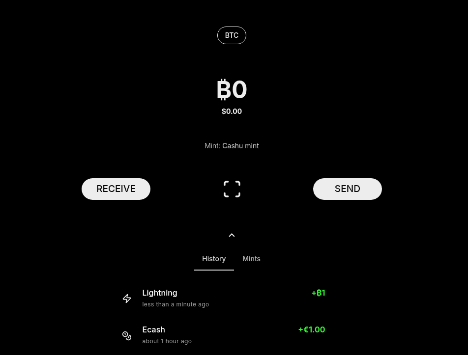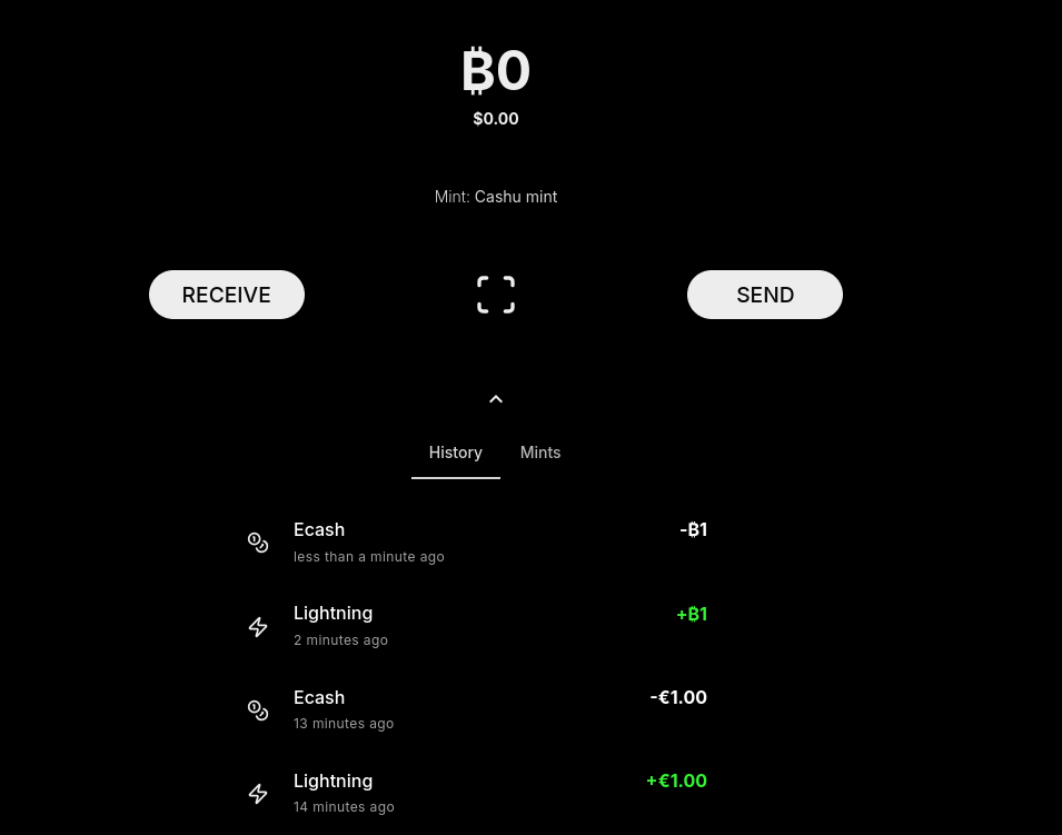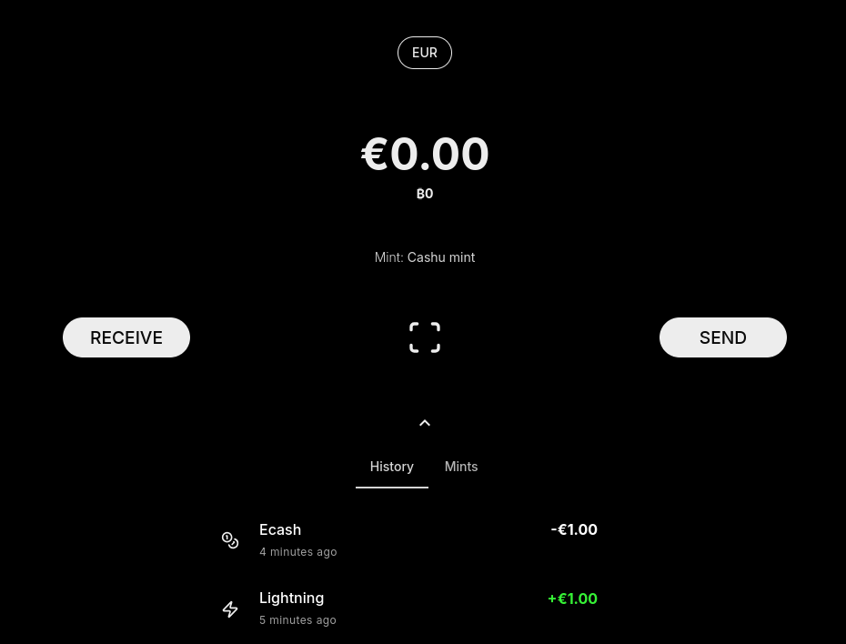 }Wallet A: User mints 1 EUR cashu token and spends it.