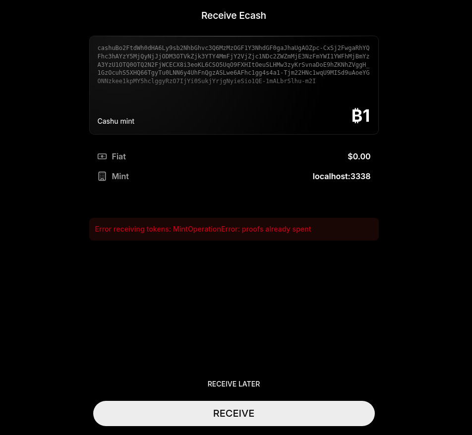 cashuBo2FtdWh0dHA6Ly9sb2NhbGhvc3Q6MzMzOGF1Y3NhdGF0gaJhaUgAOZpc-CxSj2FwgaRhYQFhc3hAYzY5MjQyNjJjODM3OTVkZjk3YTY4MmFjY2VjZjc1NDc2ZWZmMjE3NzFmYWI1YWFhMjBmYzA3YzU1OTQ0OTQ2N2FjWCECX8i3eoKL6CSO5UqO9FXHItOeuSLHMw3zyKrSvnaDoE9hZKNhZVggH_1GzOcuhS5XHQ66TgyTu0LNN6y4UhFnQgzASLwe6AFhc1gg4s4a1-Tjm22HNc1wqU9MISd9uAoeYGONNzkee1kpMY5hclggyRzO7IjYi0SukjYrjgNyieSio1QE-1mALbrSlhu-m2IWallet B: User tries to swap the received cashu token but the mint returns an error: proofs already spent.